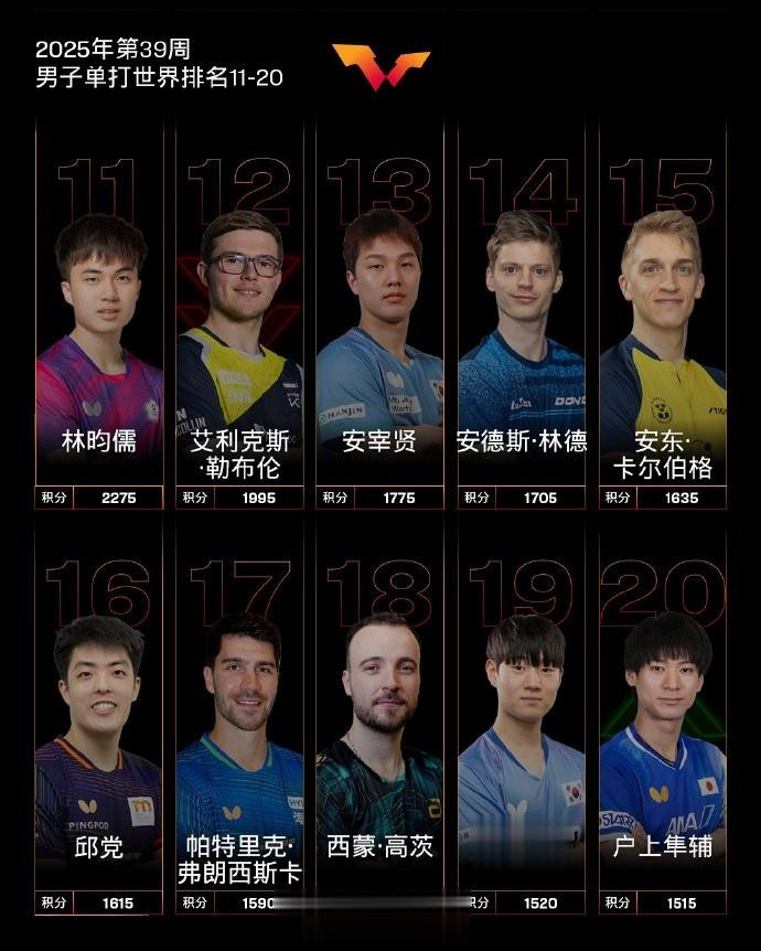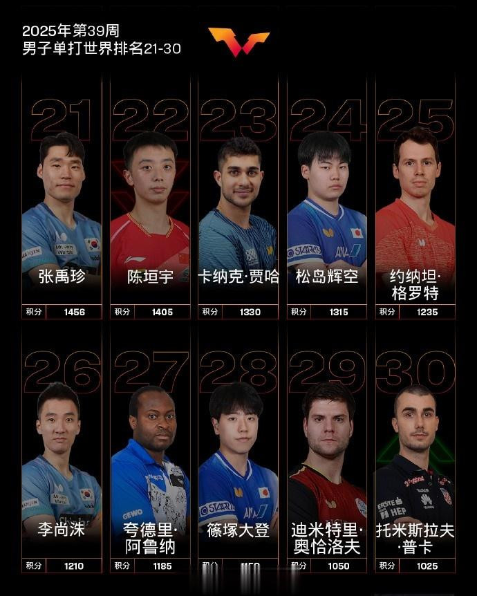 男子单打,国乒球员王楚钦、林诗栋位列前二,梁靖崑位列第六,向鹏位列第九。其他国乒球员,陈垣宇排名第22,林高远排名第31,周启豪排名第34,温瑞博排名第38,黄友政排名第47,薛飞排名第48。