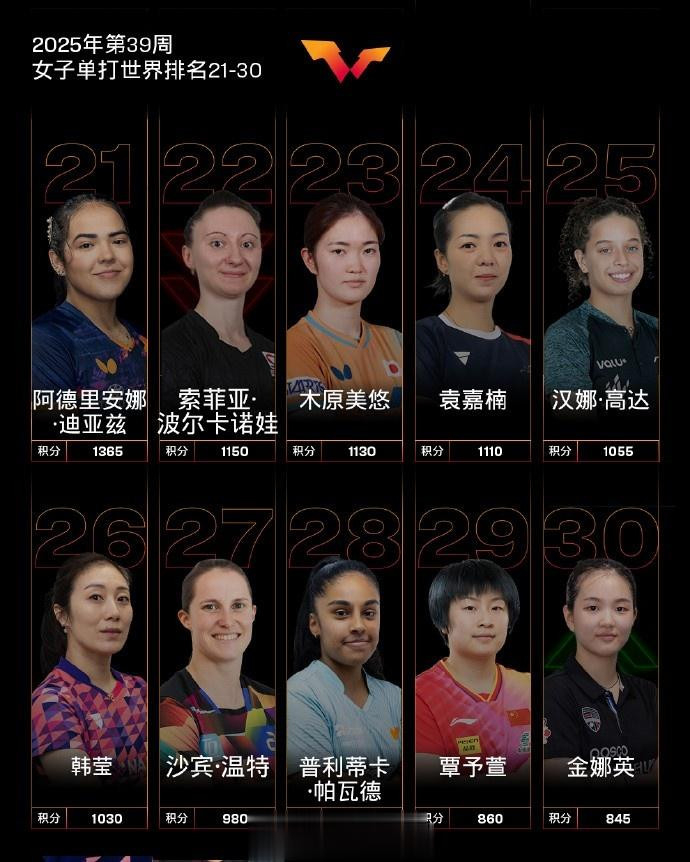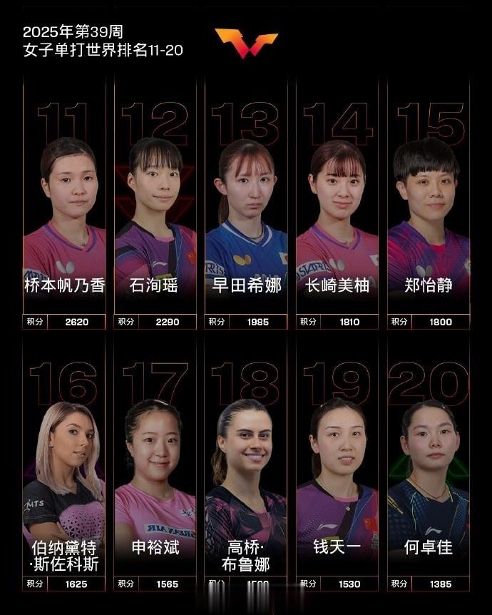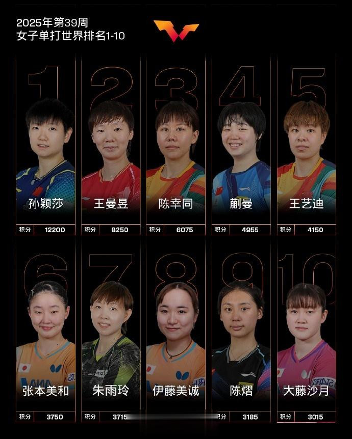 女子单打,国乒球员孙颖莎、王曼昱、陈幸同、蒯曼、王艺迪位列前五,陈熠位列第九。其他国乒球员,石洵瑶排名第12,钱天一排名第19,何卓佳排名第20,覃予萱排名第29,范思琦排名第38,王晓彤排名第43,纵歌曼排名第44。