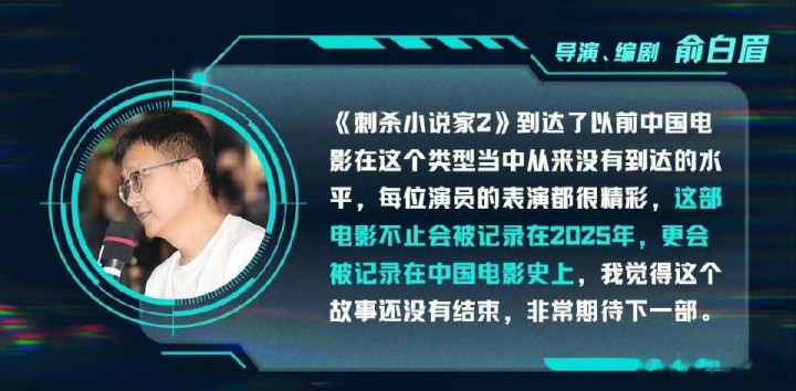 《刺杀小说家2》达到了以前中国电影在这个类型当中从来没有到达的水平,每位演员的表演都很精彩,这部电影不止会被记录在2025年,更会被记录在中国电影史上,我觉得这个故事还没有结束,非常期待下一部。