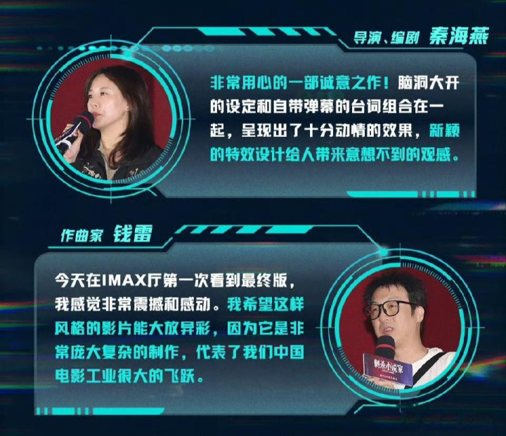 我爱这部电影,中国电影需要这样的类型和想象去拓展边界。我很喜欢故事设定,它给我们带来的哲思与现实世界和自身命运息息相关,这部电影关注到了具体的人和具体的信念,这是我们感受到的非常棒的地方!