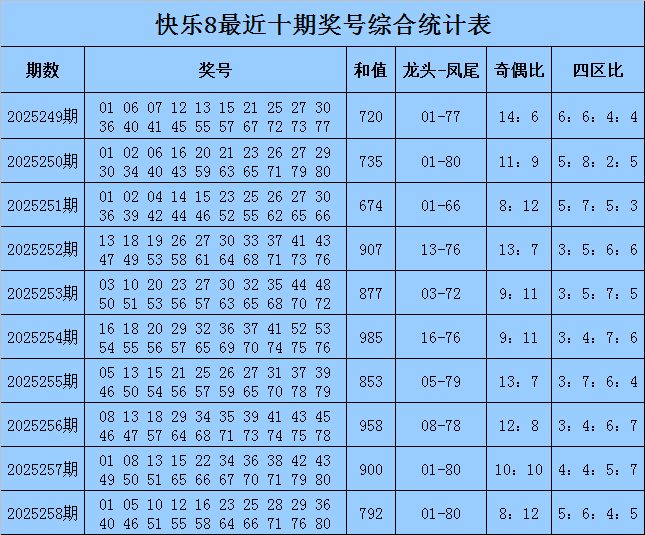 福彩快乐8第2025258期开奖回顾:01 05 10 12 16 23 25 28 29 36 40 46 51 55 58 64 66 71 76 80,其中奖号和值为792,跨度为79,奇偶比开出8:12,012路比开出4:11:5,四区比开出5:6:4:5。