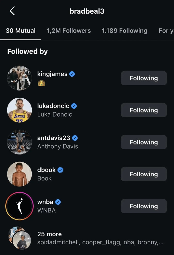 不过至今比尔都还没有表示过自己的想法,他的去向一直是个迷!然而还是球迷被发现了比尔在ins上已经和湖人队的詹姆斯、东契奇都已经互关了!不过比尔这人也是,怎么不关注下艾顿,和东契奇、詹姆斯一样都是状元,艾顿差哪了?