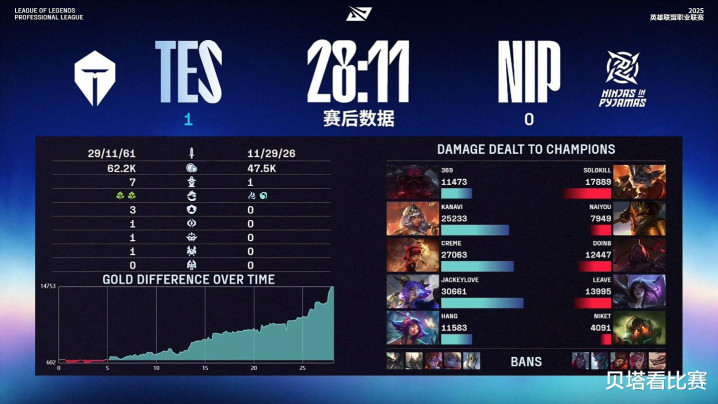 LPL季后赛TES和NIP的BO5,双方大战4局之后,TES以3-1的战绩击败NIP,晋级胜者组,下一场的对手将是WBG。NIP则是掉入败者组,将对决AL。