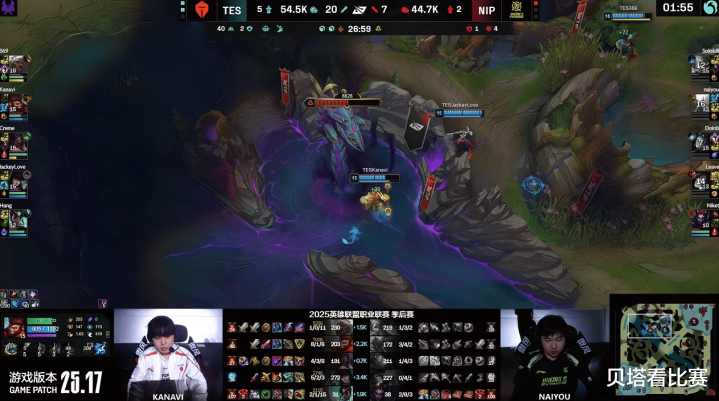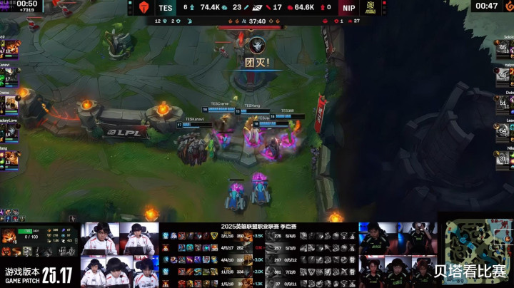 中期双方争夺小龙,NIP上野合力击杀JKL女警,但是creme阿卡丽进场收割,TES打出2换5团灭NIP。26分钟NIP上路找机会,doinb发条再次空大,TES轻松打出团灭后,拿下第一条大龙。最终TES拿下水龙魂后,在高地团灭NIP后,拿下比赛的胜利。