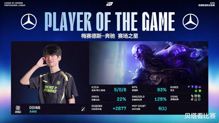 中期369奎桑提河道1V4被秒,之后双方争夺厄塔汗,naiyou塞拉斯抢下厄塔汗,不过TES团战胜利打出1换3。27分钟NIP偷下第一条大龙。最终后期30分钟双方河道混战,Leave韦鲁斯完美输出收割,NIP打出2换5后,突然一波拿下第二局的胜利。MVP给到了doinb瑞兹。