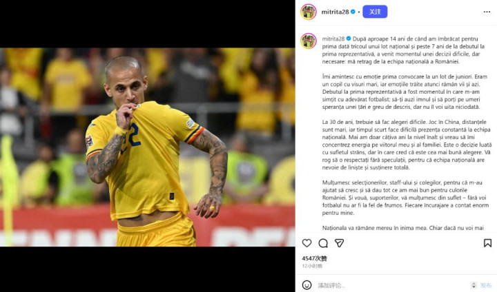 除了罗马尼亚,先后在意大利、美国、沙特、希腊联赛效力的米特里策说:“我去过很多国家,成才环境对任何人来说都是极其关键的因素。你的生活习惯、自律能力、睡眠习惯、训练水平、意志力提升等等,都会对于年轻球员的成长产生巨大影响,所以,非要让我给孩子们提建议的话,我认为从事足球运动,意志和精神的强大是成为优秀球员的关键。”