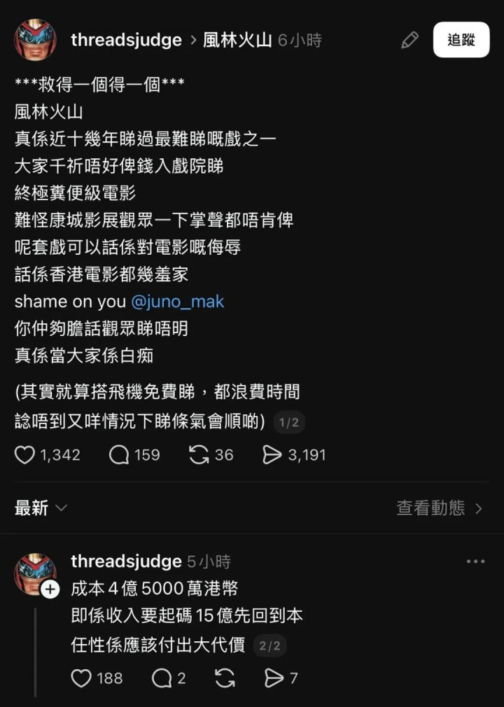 昨日电影正式上映,讨论区出现很多观后感,当中有不少负评,其中有网民狠批《风林火山》为终极粪便级电影,有超过3千多分享。