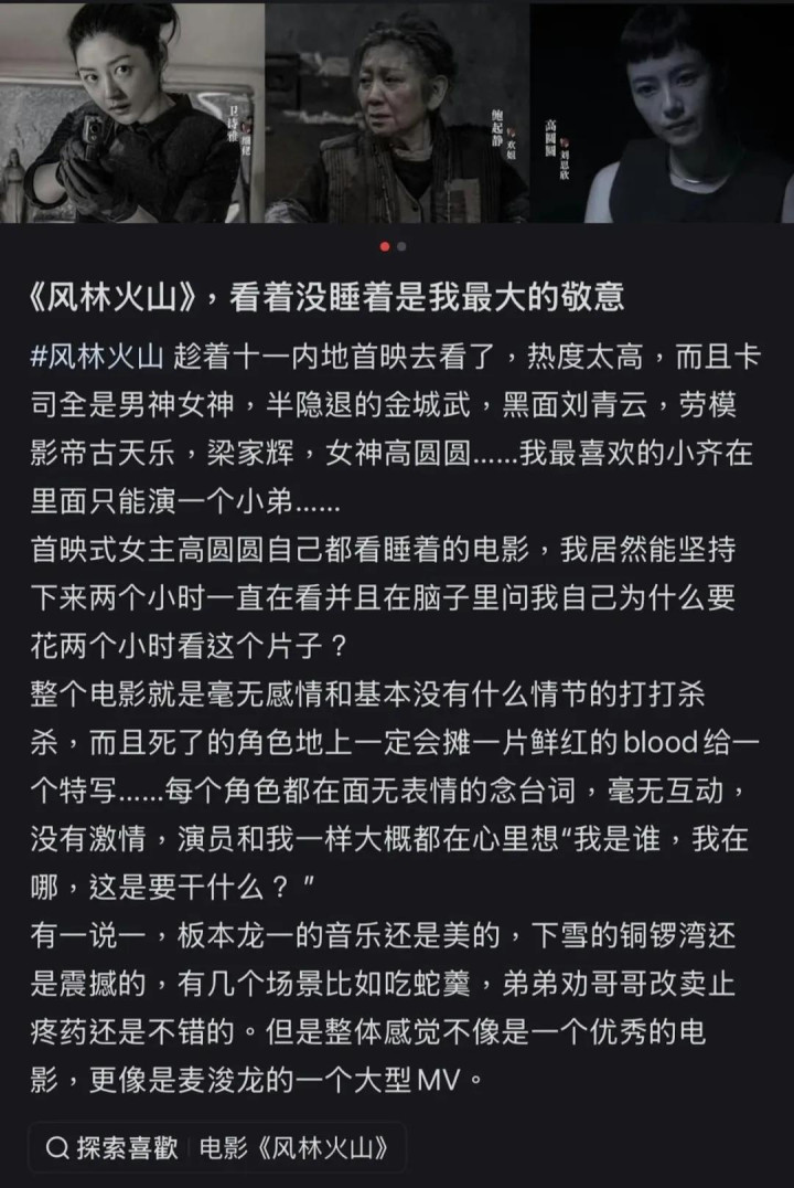 但也有人不足24小时二刷《风林火山》,大赞画面现象级凌厉,Juno暗黑美学大癫,当日内地上映,在小红书亦有不少网民发表意见,大家都大赞电影拍得很美,但看了半小时就睡着,亦有网友觉得电影是稀巴烂⋯⋯