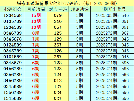 福彩3D七码遗漏组六分析(第2002001期-第2025280期)