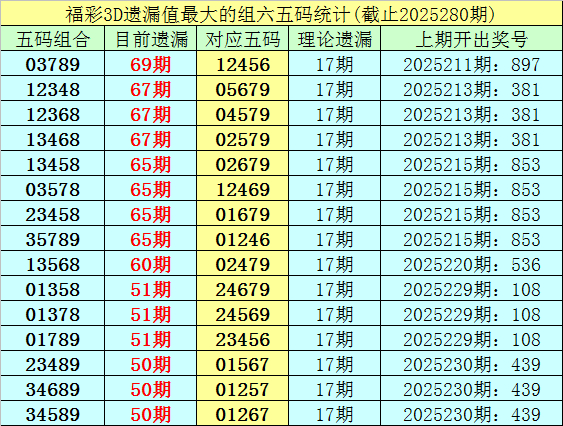 1.截止第25280期,五码组六遗漏最大的是:03789,当前遗漏69期。