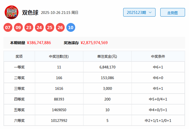开奖回顾:第2025123期双色球奖号为07、09、23、24、25、26+10。区间比:2:0:4,奇偶比:4:2,首尾间距:19。