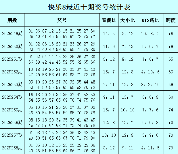 福彩快乐8第2025258期开奖回顾:01 05 10 12 16 23 25 28 29 36 40 46 51 55 58 64 66 71 76 80,其中奖号奇偶比开出8:12,大小比开出9:11,012路比开出4:11:5,和值为792,跨度为79。