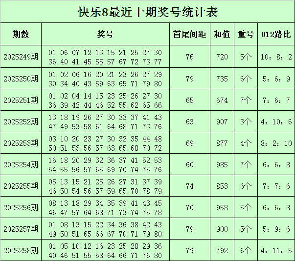 福彩快乐8第2025258期开奖回顾:01 05 10 12 16 23 25 28 29 36 40 46 51 55 58 64 66 71 76 80,其中奖号首尾间距为79,和值为792,012路比为4:11:5,包含5组同尾号码:10-40-80、01-51-71、05-25-55、16-36-46-66-76、28-58,开出6个重号:01、36、51、66、71、80。