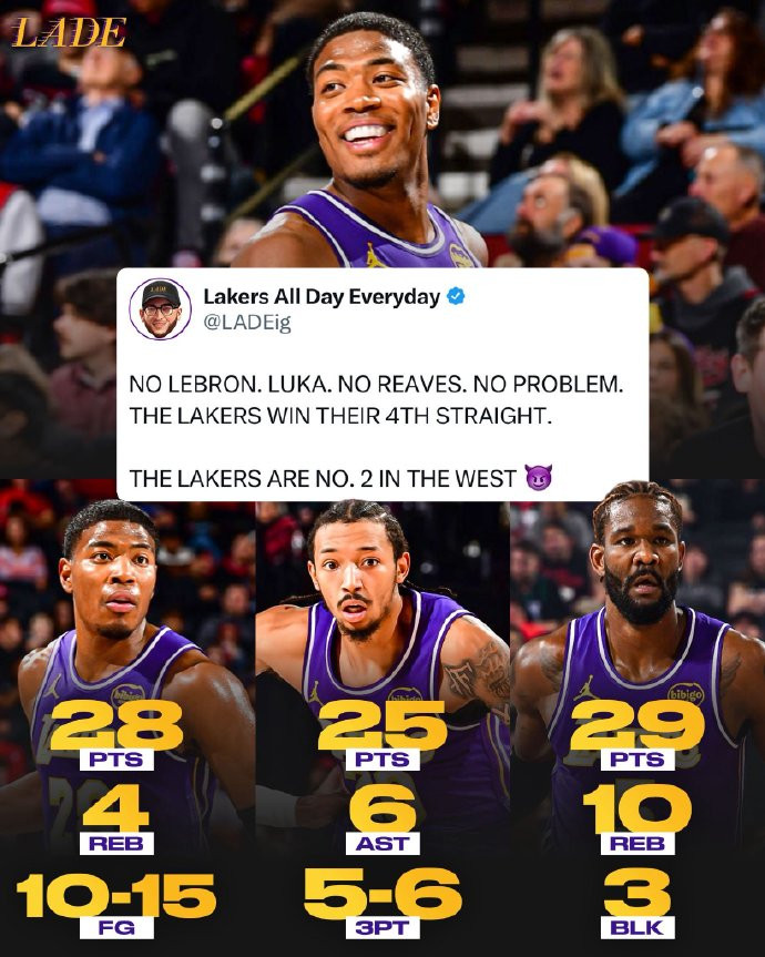 不仅如此,在客场挑战开拓者的比赛中,湖人三巨头全部缺阵,这也是本赛季首次出现这样的情况,然而湖人全队还是有3人得分25+,力克开拓者,拿到了4连胜。