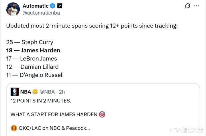 值得一提的是,哈登在此役还创下了NBA历史第2的神迹。哈登在首节2分钟内得到12分。据统计,自有相关数据统计以来(96-97赛季NBA逐回合统计场上数据),哈登共18次2分钟内得到12分,可排历史第二,勒布朗詹姆斯、利拉德分别排在第3、第4的位置。