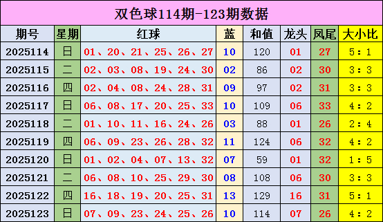 双色球第2025123期开出奖号:07 09 23 24 25 26+10。和值为114,龙头07,凤尾26,大小比为4:2。