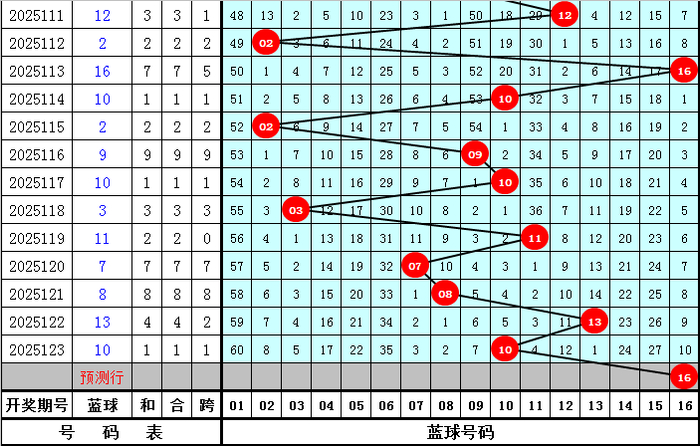 蓝球分析:上期蓝球为大号10,最近10期大号蓝球开出6次,小 号蓝球开出4次,大号蓝球表现活跃,本期继续关注大号蓝球,独蓝推荐16。