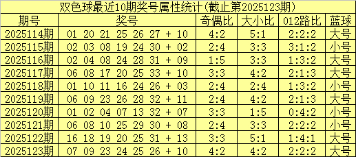 双色球第2025123期开奖号码:07 09 23 24 25 26 + 10。红球大小比为4:2,奇偶比为4:2,012路比为2:2:2,蓝球为大号。