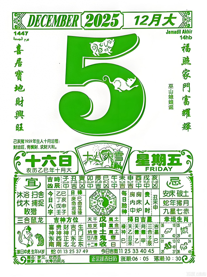 黄历心中过,遇事不出错。12月5日,星期五,农历十月十六,大家可以先留下一句:诸事皆顺。祝福一下自己。这天值神是天刑,象征事务易遇阻碍或拖延,这天需注意遵守规则,避免冲动决策。这天是收日,象征适合进行收纳、清理和总结工作,代表事物阶段的完结与成果积累。穿衣颜色推荐黑色、蓝色、灰色系。不推荐绿色、青色、翡翠色。打麻将求职找工作的可以去北边,约会谈恋爱的可以约在家东南边。生肖注意事项,小鼠鸿运当头,小牛阻力较大,小虎压力很大,小兔起伏不定,小龙洞察力强,小蛇顺心如意,小马积极上进,小羊诸事不顺,小猴好运降临,小鸡做好管理,小狗神采奕奕,小猪圆融一些,有缘刷到,祝你开心,福生无量。